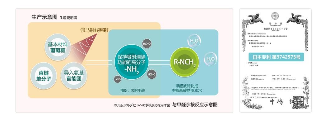 荃芬采用的是日本專利(專利第3742575號(hào))氨基除甲醛解決方案。產(chǎn)品基本原料是葡萄糖等安全物質(zhì),原料經(jīng)過伽馬射線照射,生成穩(wěn)定的氨基高分子聚合物,捕捉、吸附空氣中的甲醛,并與其反應(yīng)生成類氨基酸物質(zhì)與氣態(tài)水。