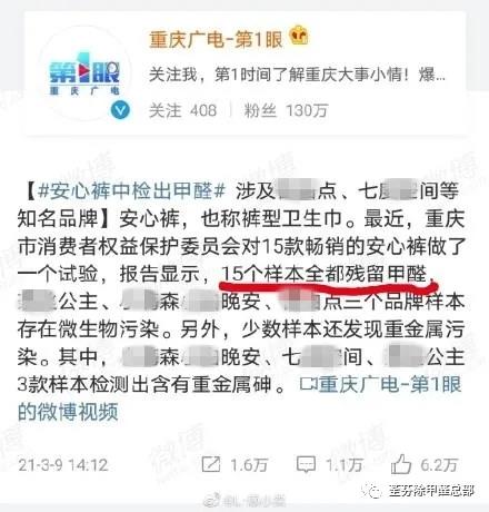3月9日媒體報道,重慶市消費者權(quán)益保護委員會對15款暢銷的安心褲——幾乎包含女性們所用的所有衛(wèi)生巾大品牌,如七D空間、護S寶等、ABX,——做了一個試驗,報告顯示,15個樣本全部殘留甲醛。引發(fā)許多網(wǎng)友的恐慌。很多安心褲品牌不得不出來發(fā)表聲明:甲醛是有的,但是是符合國家標(biāo)準(zhǔn)的。