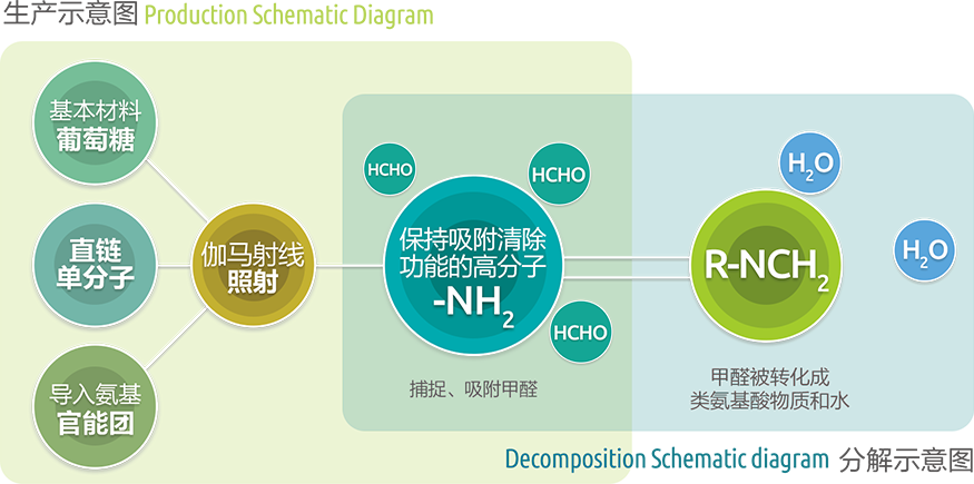 基本原料是葡萄糖等安全物質(zhì),原料經(jīng)過伽馬射線照射,生成穩(wěn)定的氨基高分子聚合物,捕捉、吸附空氣中的甲醛,并與其反應(yīng)生成類氨基酸物質(zhì)與水。整個反應(yīng)過程安全高效,反應(yīng)后無任何有害物質(zhì)生成。